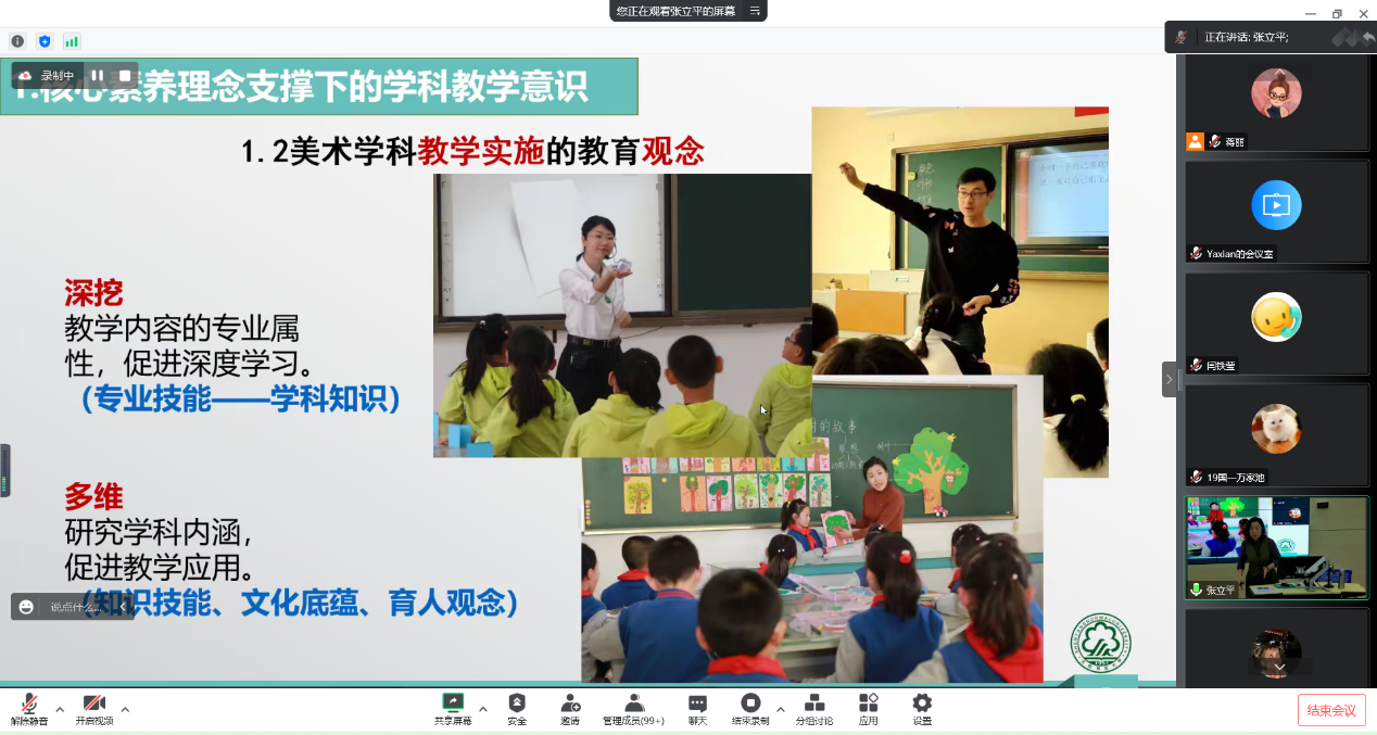 张立平老师为提高同学们的师范专业素养主要从学科教学意识、如何上好美术课以及教学技能训练途径与办法三大方面展开教学。第一部分首先探索了“教育+美术”的问题,即以美育人、重视学科定位。特别强调了“当老师的要带有信仰感去认识学科育人的重要性”。接下来张老师又用具体生动的几堂公开课为例为同学们就教学实践等内容解答疑惑。最后张老师有以清晰的脉络梳理了教学技能训练的方法与途径,更有幸连线沈阳师范大学优秀毕业生现场实战,高效高质量的完成随机教学设计。整个讲坐下来不仅同学们受益匪浅,共同参会的老师们也感受到了教育的崇高意义,课堂反响热烈,大家都与张老师热情互动,在学与教的氛围中共同深入挖掘从师能力培养的课题。