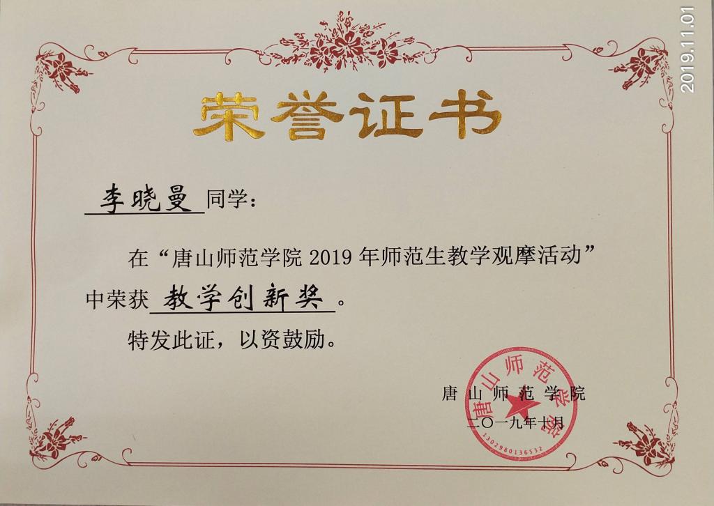 2019年10月8日下午举行6776永利集团2019年师范生讲课观摩活动,全校各系派范生进行讲课大赛,美术系理李晓曼同学最终获得了“教学创新”奖。