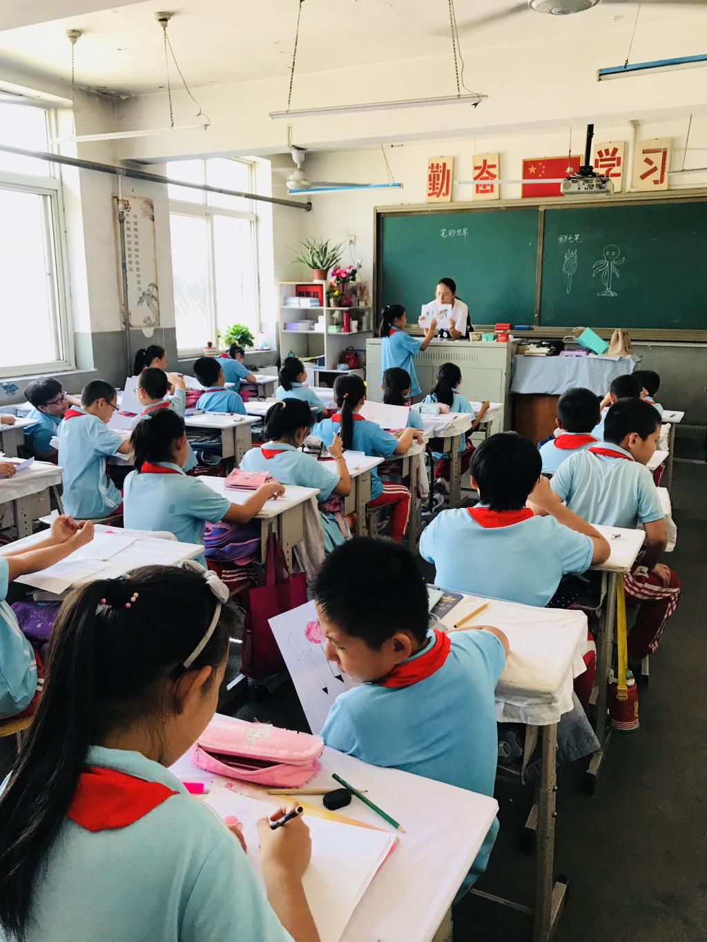 在此期间,美术系本科四年级优秀师范生李晓曼同学精心准备教案及讲稿,设计教学互动环节。同时,由张高志主任、孙萌、王胜彩、蒋丽四位一线骨干教师组成了教学指导团队,每周两次对课程指导与评价,在多番讲课练习整改后深入唐山市河北路小学实际教学与调研,把设计的课程《笔的世界》面向四年级学生讲授,从中归纳了本年龄阶段学生特殊心理特点,收集了课堂优秀作品,从而与模拟课堂相结合,设计了课堂突发问题环节与作品展示环节,真实反映了这一阶段学生的特点。