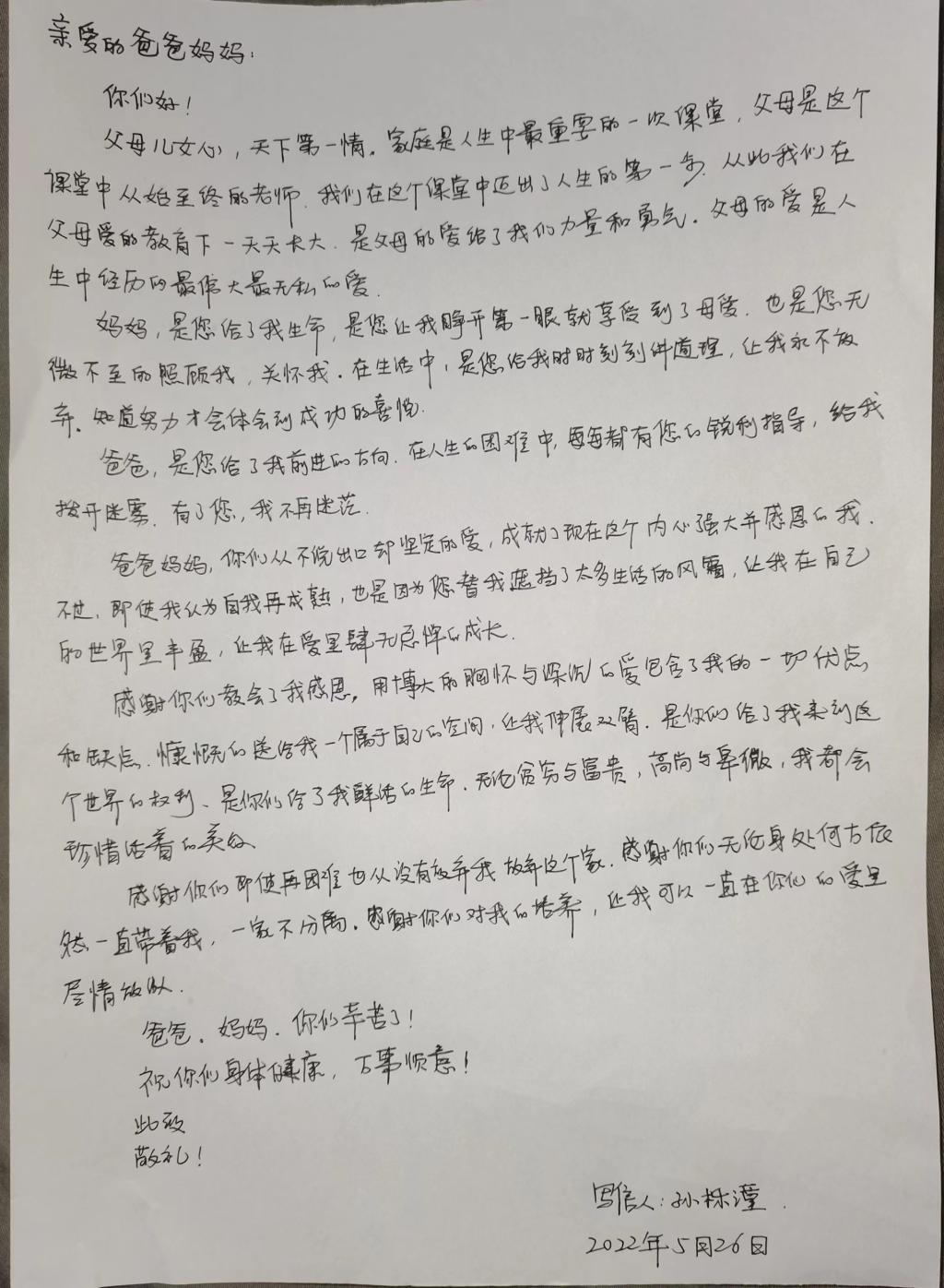 大学毕业标志着一个人正式的走向社会,收拾行囊不只说明一段行程的结束,更代表一个新的行程的开始。“谁言寸草心,报得三春晖”。作为毕业生要深刻领会母校和父母的精心培育,在即将结束大学生活之际,yl6776永利集团倡导每一位毕业生用家书、短信、电话等方式向父母表达真挚的问候,以报答养育之恩。