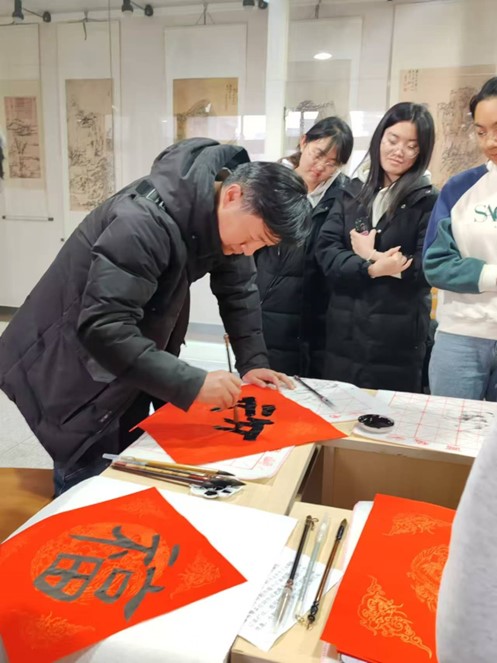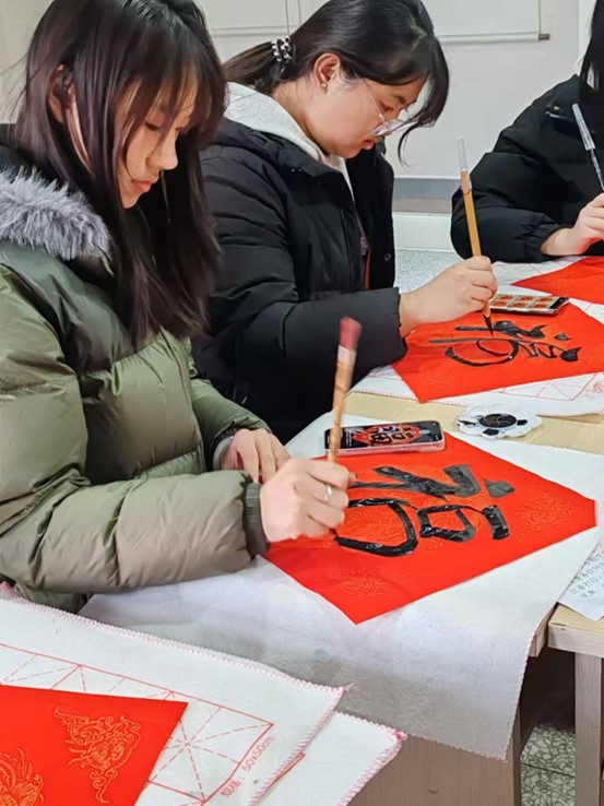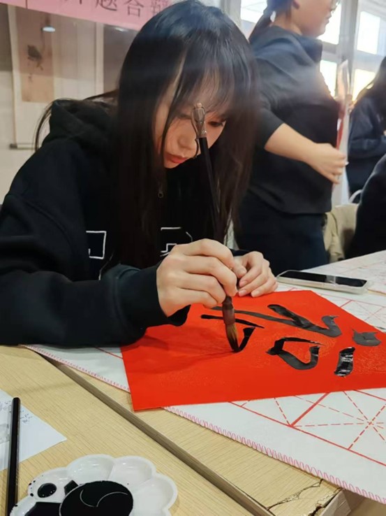 于露老师以其深厚的艺术造诣和丰富的教学经验,为学生们进行了深入浅出的讲解和示范。他不仅详细阐述了“福”字的文化内涵和象征意义,还亲自示范了笔法的运用和字体的结构,学生们迅速进入了创作状态。他们神情专注,笔走龙蛇,一个个“福”字在他们的笔下跃然纸上。