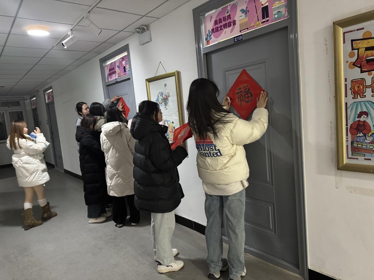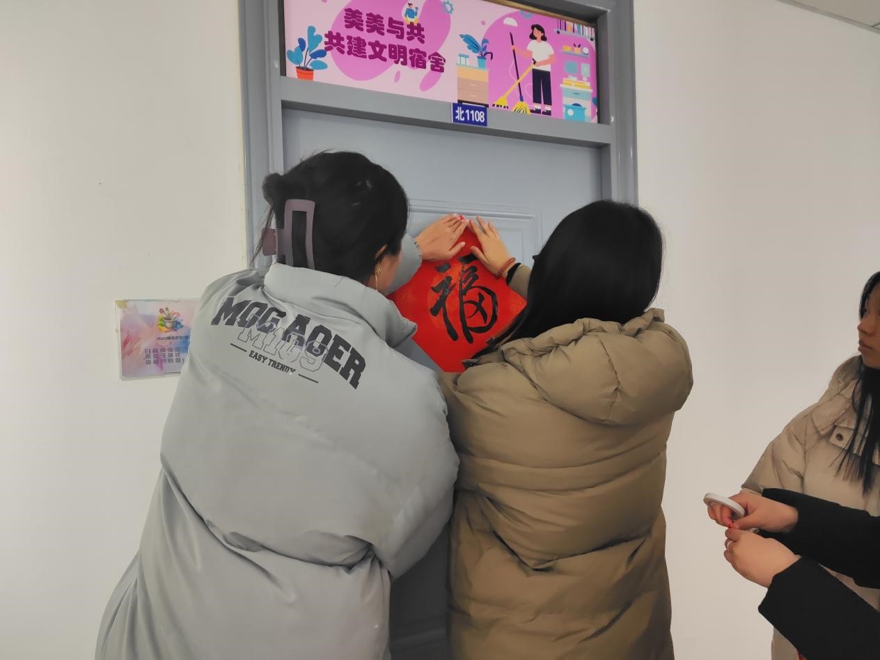 完成创作后,学生们带着自己亲手书写的“福”字,来到了宿舍区。他们精心挑选位置,将“福”字张贴在宿舍的门口,窗户上等。这些红彤彤的“福”字不仅为宿舍增添了浓厚的节日氛围,更成为了学生们心中最美好的新年祝愿。