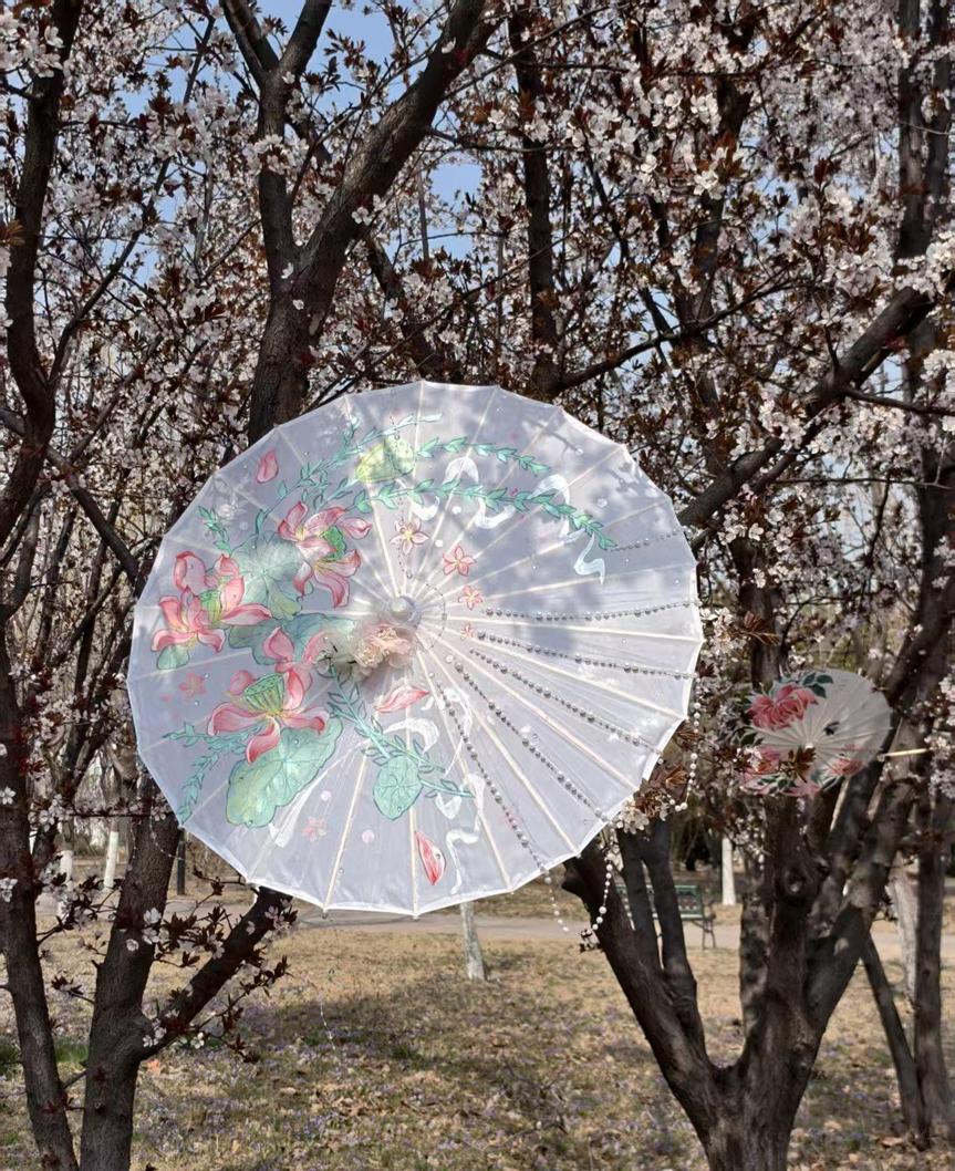 彩绘体验环节,大家尽情挥洒艺术灵感。素面油纸伞之上,有人勾勒水墨山水,晕染江南烟雨的诗意;有人描绘繁花锦鲤,寄托平安顺遂的祈愿;更有同学将现代设计理念与传统纹样巧妙融合,让古典美学与当代创意碰撞出别样火花。每一把完成的油纸伞,都是传统文化与艺术创意的完美交融。