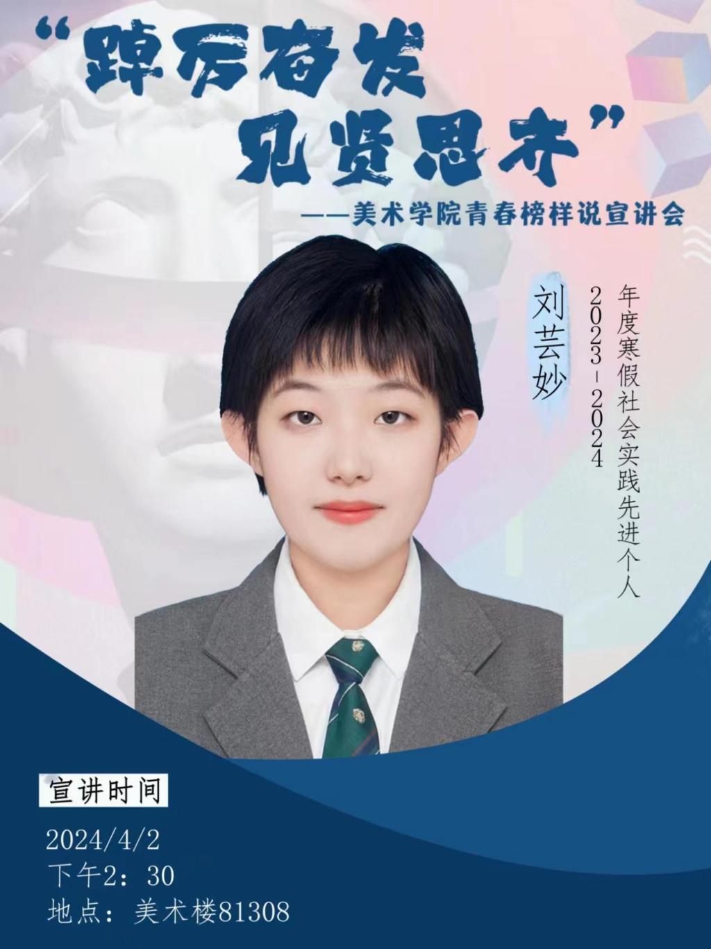 刘冰同学则分享了自己在艺术创作中遇到的困难与挑战,以及如何克服这些困难的经历。他表示,艺术创作需要不断地尝试和探索,遇到挫折和困难时,要保持积极的心态和坚定的信念,相信自己一定能够战胜困难,实现自己的艺术梦想。