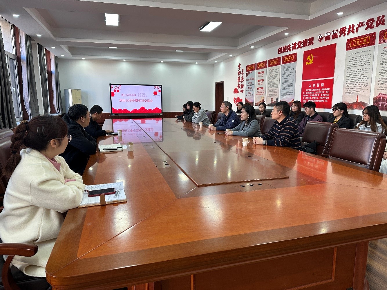 2025年03月19日下午,yl6776永利集团院长高一帆与资源管理系主任沈方、yl6776永利集团副书记王璐、副院长石野飞到唐山市第五中学走访调研,实地考察实习单位并慰问14名实习生。双方与五中校长、副校长、艺术处处长及全体实习生召开座谈会,围绕教育实习质量提升、校际协同育人等议题展开深度交流。