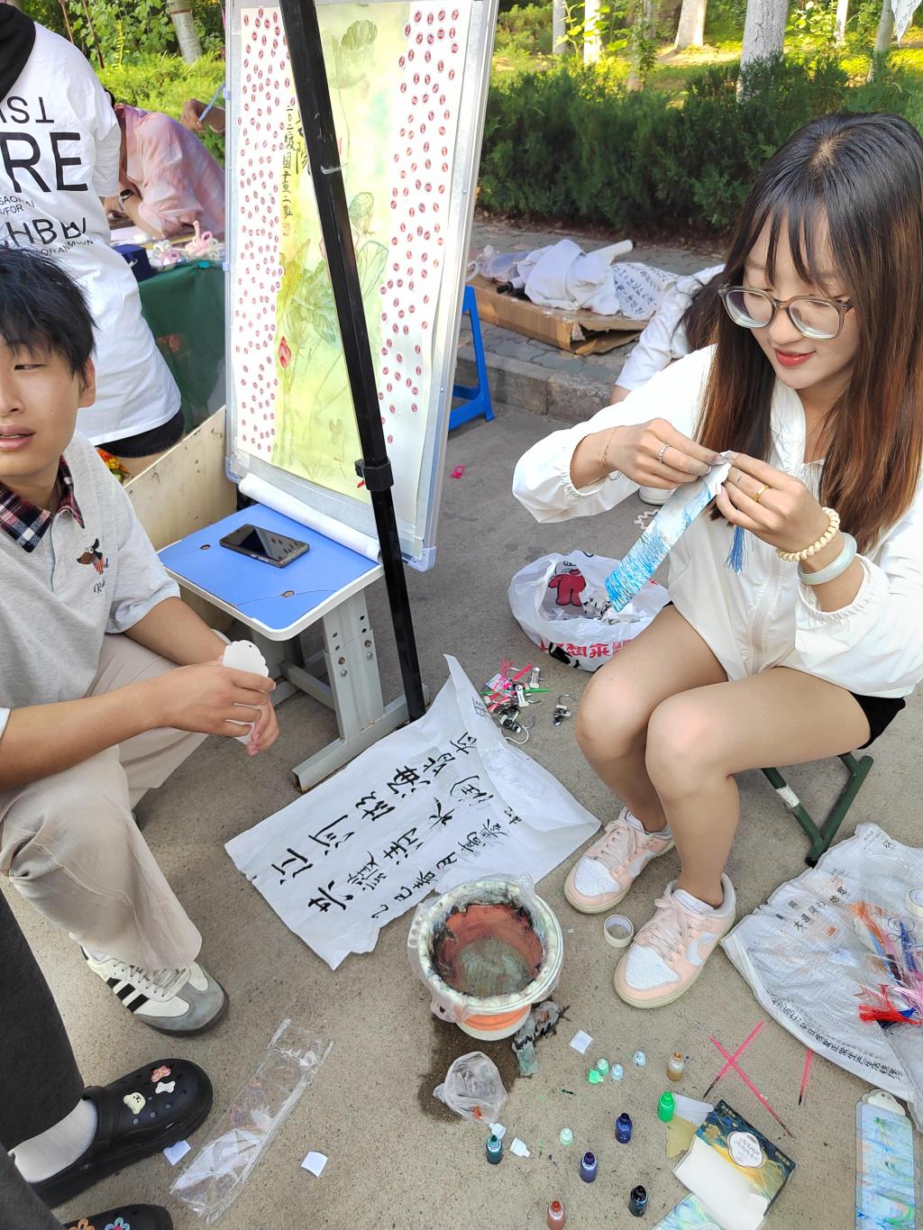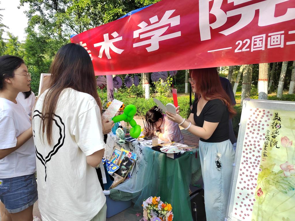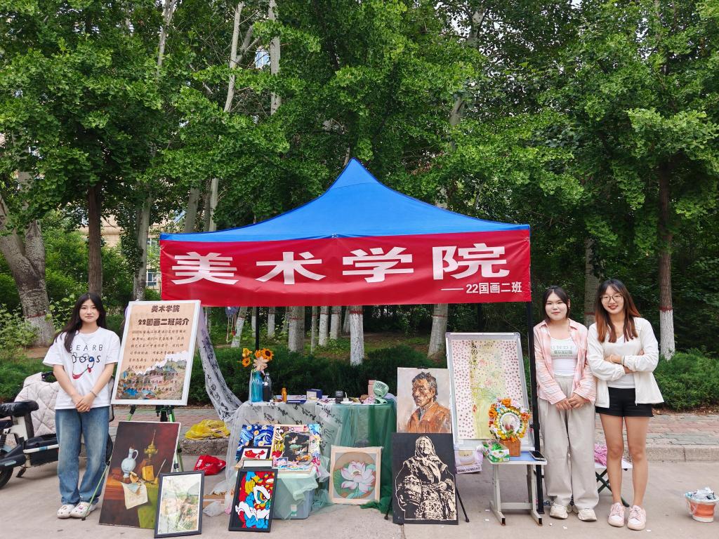 活动现场,22级国画二班的展示摊位布置得别具一格。摊位上方,“yl6776永利集团——22级国画二班”的红色横幅格外醒目。摊位内,各类艺术作品错落有致地摆放着,水彩画色彩斑斓,细腻笔触间尽显绘画功底;篆刻作品古朴雅致,方寸之间蕴含艺术匠心。