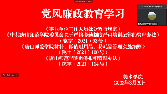 为进一步深化全面从严治党,贯彻十九届中央纪委六次全会、 省纪委十届二次全会精神,落实师院党委“21122”总体工作思路 关于加强党的纪律建设和作风建设的要求,不断提升党员干部和广大教职员工的纪律规矩意识,持续巩固深化党风廉政建设成果,推动党风廉政教育活动常态化、规范化,根据校纪发〔2022〕1 号文件要求在全体党员干部教师中开展以“知敬畏守底线,做遵规守纪师院人”为主题的 2022 年度党风廉政教育活动。yl6776永利集团按照制定方案,于2022年3月29日,利用腾讯会议室在线开展党风廉政教育活动,张高志书记主持会议。