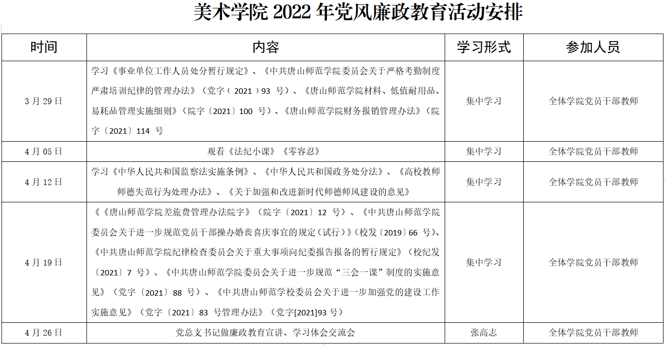 为进一步深化全面从严治党,贯彻十九届中央纪委六次全会、省纪委十届二次全会精神,落实师院党委“21122”总体工作思路 关于加强党的纪律建设和作风建设的要求,不断提升党员干部和广大教职员工的纪律规矩意识,持续巩固深化党风廉政建设成果,推动党风廉政教育活动常态化、规范化,根据校纪发〔2022〕1 号要求在全体党员干部教师中开展以“知敬畏守底线,做遵规守纪师院人”为主题的 2022 年度党风廉政教育活动。