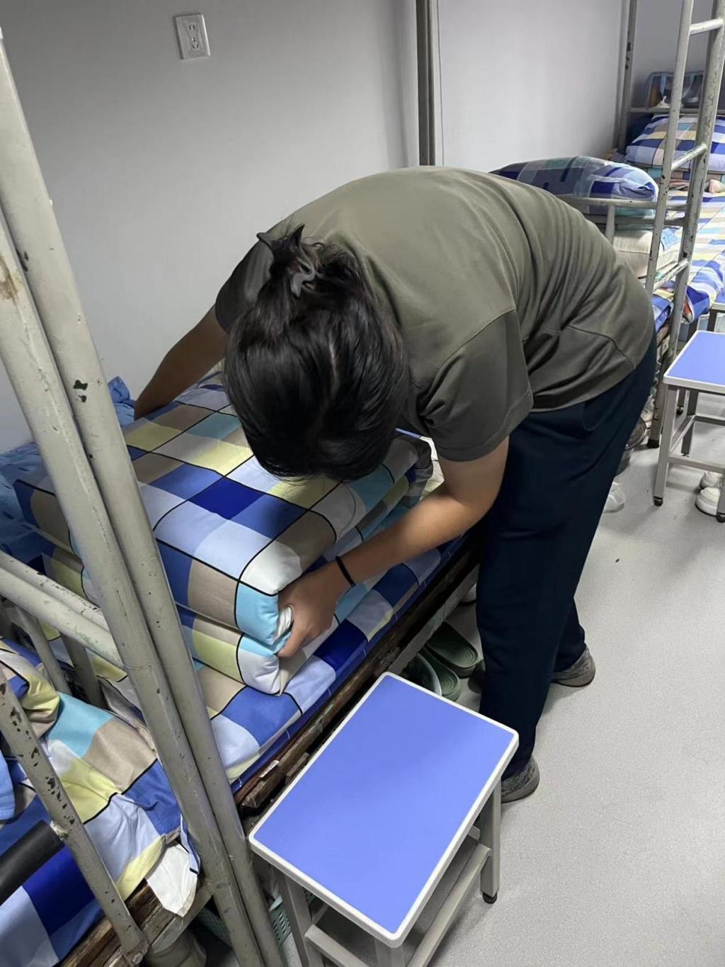 教官们首先认真检查每个学生的被子叠放是否整齐、衣物摆放是否有序,卫生情况是否达标。随后,他们还向新生们传授叠“豆腐块”的技巧和方法,让他们在实践中不断提高自己的内务整理能力。同时,教官的亲身传授点燃了同学们的热情,重新对自己个人物品进行整理,力求做到最好。